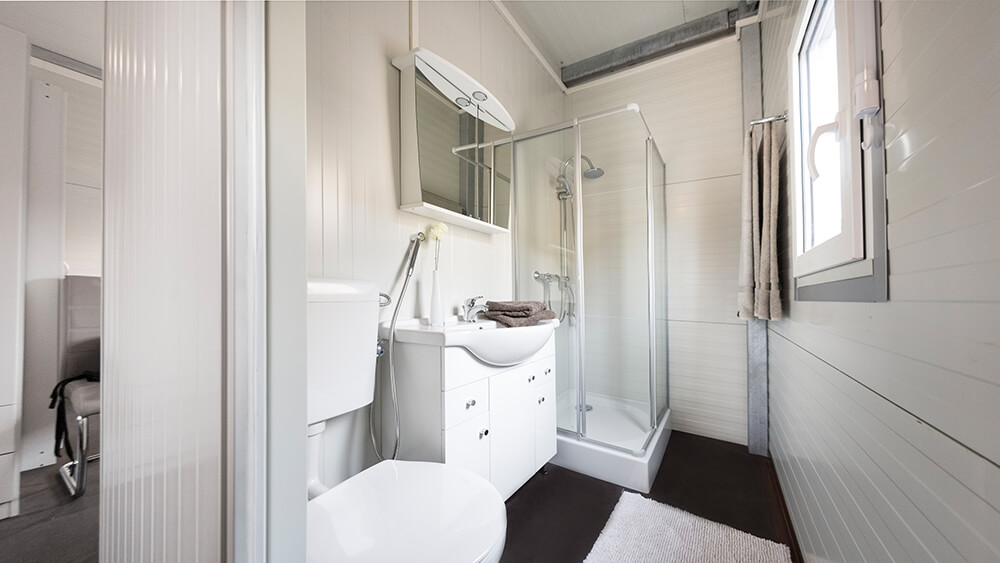 En option: vous pouvez choisir que la salle de bains de votre conteneur résidentiel soit équipée avec un sèche-serviette électronique 600 W avec thermostat.