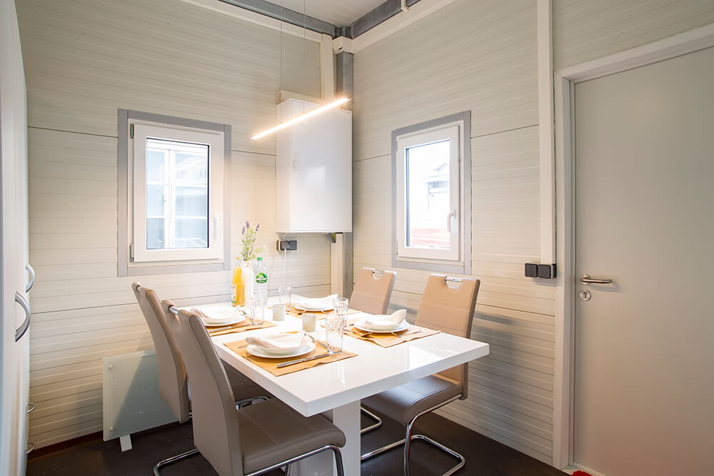 L’espace salon du conteneur résidentiel offre assez d’espace pour que 4 personnes puissant y prendre leurs repas et sert de salon . Les deux fenêtres en angle remplissent l’espace avec une abondante lumière naturelle.