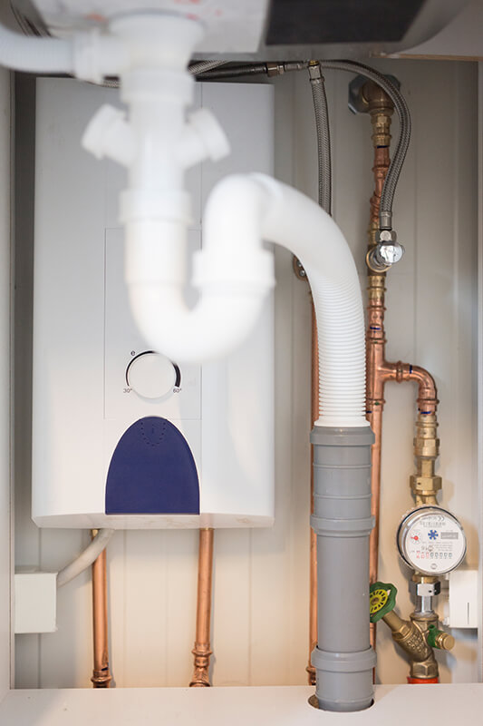 Le chauffage de l’eau est fourni dans la cuisine et la salle de bains par un chauffe-eau sans réservoir de 18kw. S’il n’y a pas de ligne 400V disponible, un chauffe-eau de 230V peut aussi être fourni (avec coût supplémentaire).