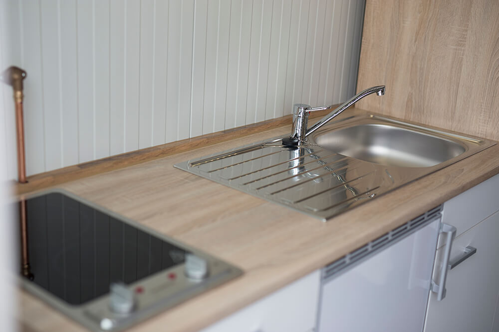 Le coin cuisine offre toutes les commodités d’une cuisine modern dans une forme compacte. Il est livré équipé avec les appareils de cuisines fonctionnels et offre beaucoup d’espace de rangement.