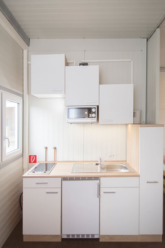 Contrairement à la restauration collective, la grande kitchenette du conteneur contient divers appareils et permet aux résidents de se préparer confortablement leurs propres repas de manière autonome.