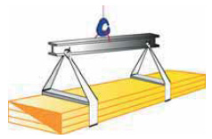 Lors du levage d'un colis avec la grue, des sangles en matériaux synthétique (par exemple en Nylon) avec une largeur minimale de 10 cm doivent être disposés à au moins deux endroits. Les sangles doivent être espacées d'au moins la moitié de la longueur de l'emballage. Pour éviter d'endommager le panneau supérieur lors du levage, disposez une entretoise en bois ou plastique en partie supérieur tel que sur le schéma ci-dontre. Ceux-ci devront dépasser la largeur despanneaux d'au moins 4 cm.