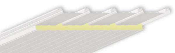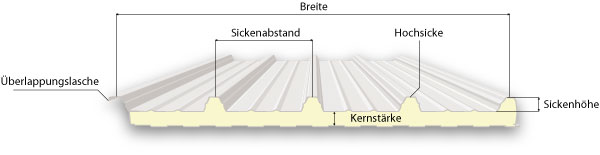 Les panneaux de toiture combinent à la fois l'isolation et l'étanchéité de toiture. On peut tout de suite remarquer les élémvations régulières sur ces éléments sandwich. Ceux-ci sont appelés trapèzes et servent à conférer une inertie mécanique supplémentaire à ces panneaux, utile pour la résistance en flexion. Une bonne rigidité est indispensable en toiture, car en plus de leur poids propre, les panneaux sandwich subissent des charges d'exploitation, de neige et de vent. L'espace entre deux trapèzes est appelé partie basse. L'épaisseur nominale des panneaux y est ici mesurée. Afin d'assurer l'étanchéité entre deux panneaux de toiture, un trapèze de chevauchement est également présent. Celui-ci viendra recouvrir le trapèze du panneau qui lui sera juxtaposé.