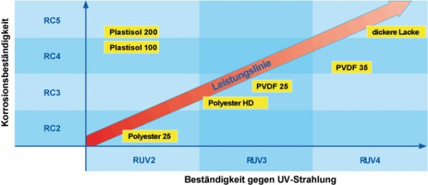 Le revêtement est une protection supplémentaire du panneau sandwich contre la corrosion et le rayonnement UV. Il existe différents niveaux de qualité, sellon la zone d'application. La qualité de laquage peut être augmentée de deux possibilités: par des procédés de revêtement ou par un revêtement plus épais. Le revêtement standard de panneaux sandwich est un polyester standard d'épaisseur 25 μm, à l'intérieur comme à l'extérieur. La plupart de nos concurrents offrent seulement 15 μm en standard. Voici nos différents revêtements disponibles en production: